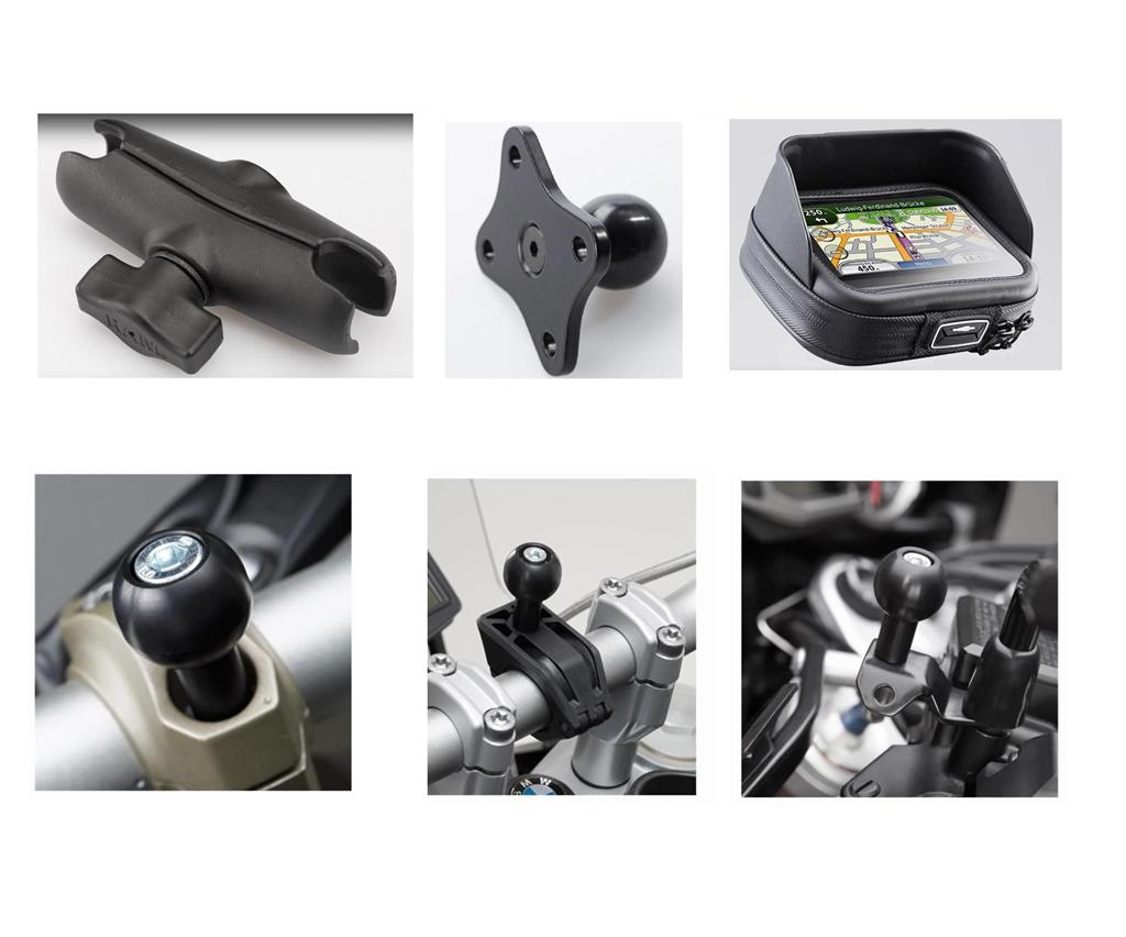 Clamps with rubber insert adapters, Ball M8 and adapter for ball M6, Mirror thread GPS-Mount, RAM-Arm (8 cm), Universal Mount, NAVi-Bag M (15 x 10 x 4 cm) Mounting material