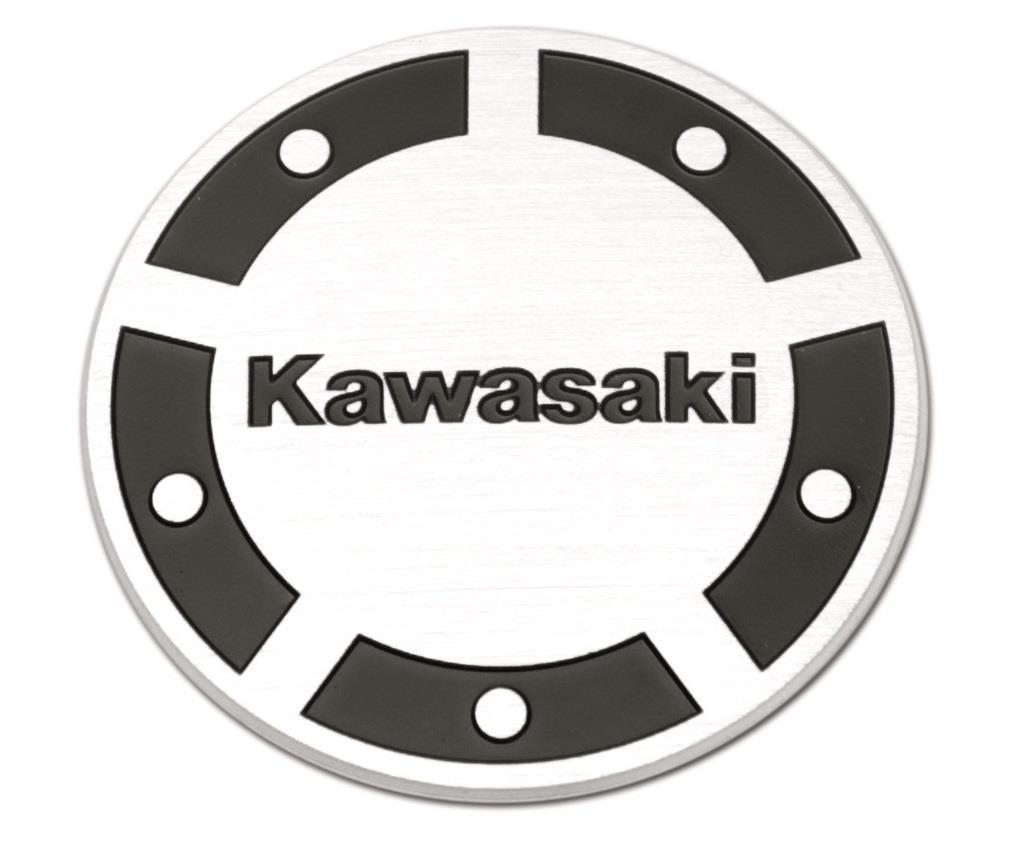 Black clutch cover plate with aluminium colored insert with Kawasaki logo.